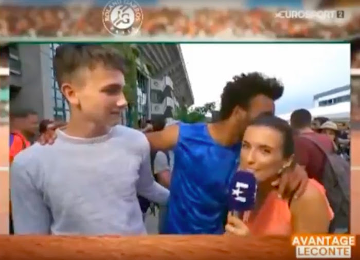 Ew. While a reporter interviews tennis player Hamou on live TV, he keeps pulling her in with a one-arm embrace and kissing her. He even wraps his arm around her neck at one point. She tries to pull away as she continues to interview him. What she needs to do is clobber him over the head with her mic.
