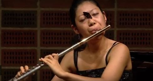 Flautist Youkie Ota thought she was going to nail Pierre Sancan's minimalist arrangement for flute and piano at the Carl Nielsen International competition in Odense, but hadn't planned on a butterfly swooping in to try and fuck her up! During the sonatina's second movement, it just totally landed on her face right there in the middle of the concert hall. Ota forged on through the Andante Espressivo, though, overcoming the insect in a long and brutal battle of wills, waiting until a quiet moment to fling her foe to one side. Only when the cameras were off did Ota get a chance to give her vanquished enemy a free ride home—on her bootheel.